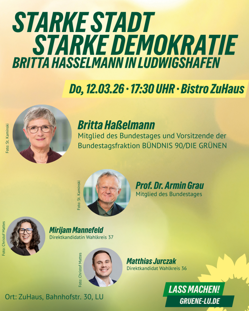 Am Donnerstag, den 12. März 2026, um 17:30 kommt Britta Haßelmann, Mitglied des Deutschen Bundestages und Vorsitzende der Bundestagsfraktion vom Bündnis 90/Die Grünen nach Ludwigshafen. Gemeinsam mit Armin Grau, MdB, Marijam Mannefeld, Direktkandidatin WK37 und Matthias Jurczak, Direktkandidat WK 36, diskutieren Sie mit mit Euch über die aktuellen politischen Herausforderungen, eine starke Stadt und eine lebendige Demokratie.
