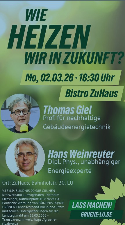 Informationsveranstaltung am Mo. den 02.03.2026 um 18:30 zum Thema „Wie heizen wir in Zukunft?“ mit dem Prof. für nachhaltige Gebäudeenergietechnik Thomas Giel und dem unabhängigen Energiexperten Dipl. Phys. Heinz Weinreuter. Thomas Giel erklärt die europäischen und nationalen Rahmenbedingungen und warum das Gebäudeenergiegesetz (GEG) richtig und wichtig ist, während die neuen Vorschläge der schwarz-roten Bundesregierung den Klimaschutz massiv schwächt und Mieter und Mieterinnen mit stark steigenden Kosten belastet werden, wenn ihre Heizung mit ’sogannten grünen Gasen“ betrieben werden. Er beleuchtet innovative Lösungen von der Beistellwärmepumpe bis zu Bürgernetzen und stellt das Konzept „Bürger beraten Bürger“ vor. Anschließend bietet Hans Weinreuter als unabhängiger Energieexperte eine offene Energieberatung und beantwortet individuelle Fragen rund um Wärmepumpe, Fördermittel und Heiztechnik. Matthias Jurczak, Direktkandidat für Ludwigshafen I führt durch die Veranstaltung. Ort: Bistro ZuHaus, Bahnhofstraße 30, 67059 Ludwigshafen